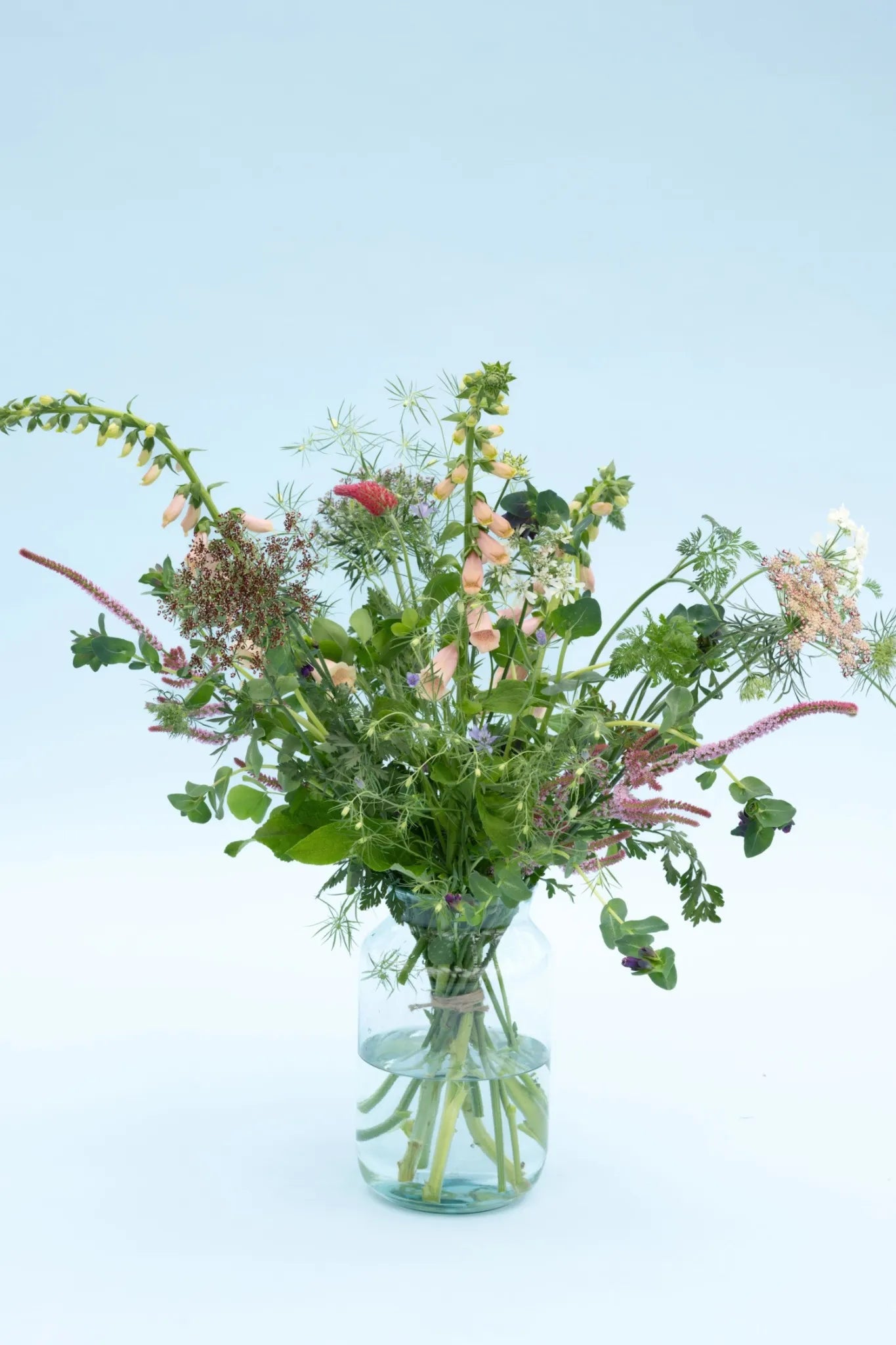 Het large boeket bevat gemiddeld 25 bloemstelen: zorgvuldig gecombineerd op kleur, vorm en bloeitijd. Denk aan fluweelzachte dahlia’s in de nazomer, pittige kaardebollen in de herfst of botanische tulpen in het voorjaar. Ieder boeket is een ode aan het seizoen – rauw, echt en vol leven.